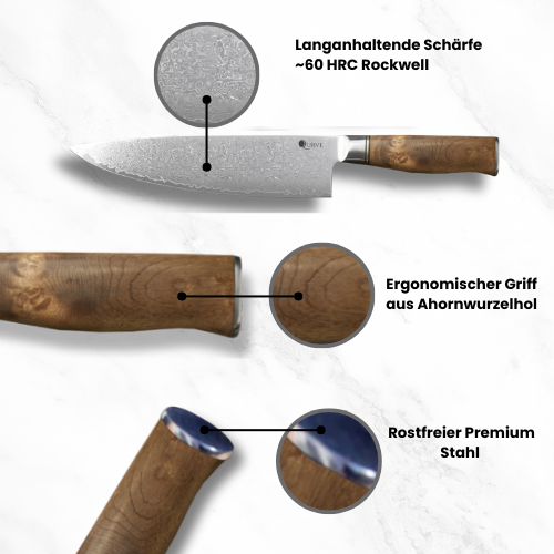 Klingenmaterial: 67 Lagen Damaskus Stahl (VG-10 Stahlkern + 66 Lagen Damaststahl)