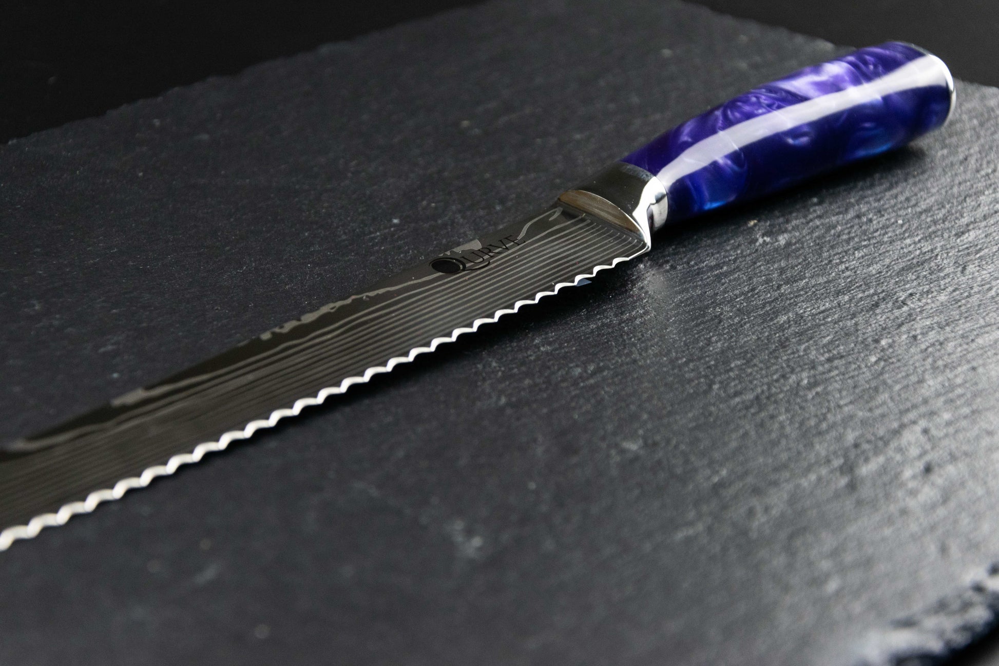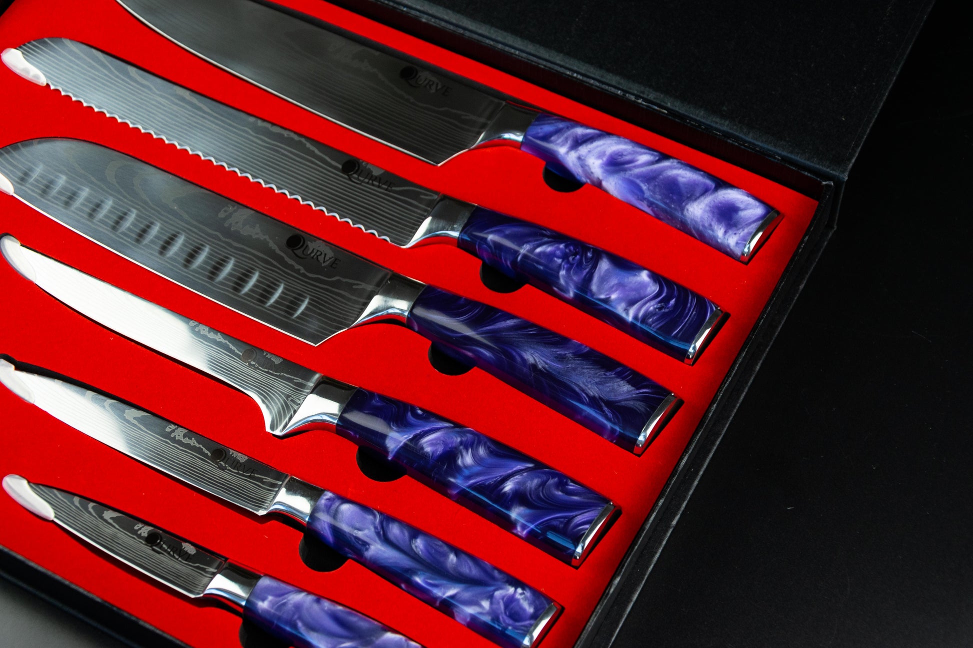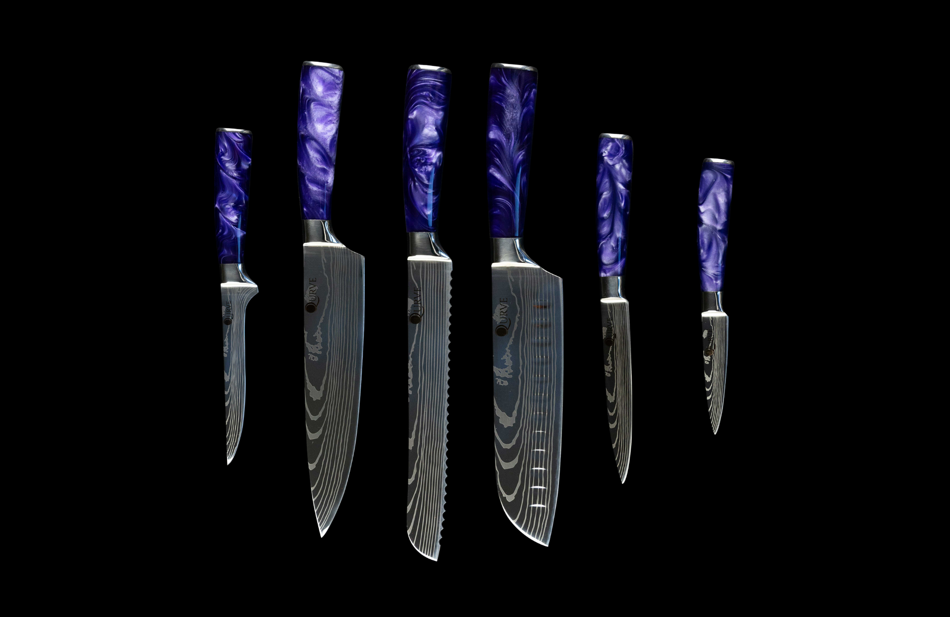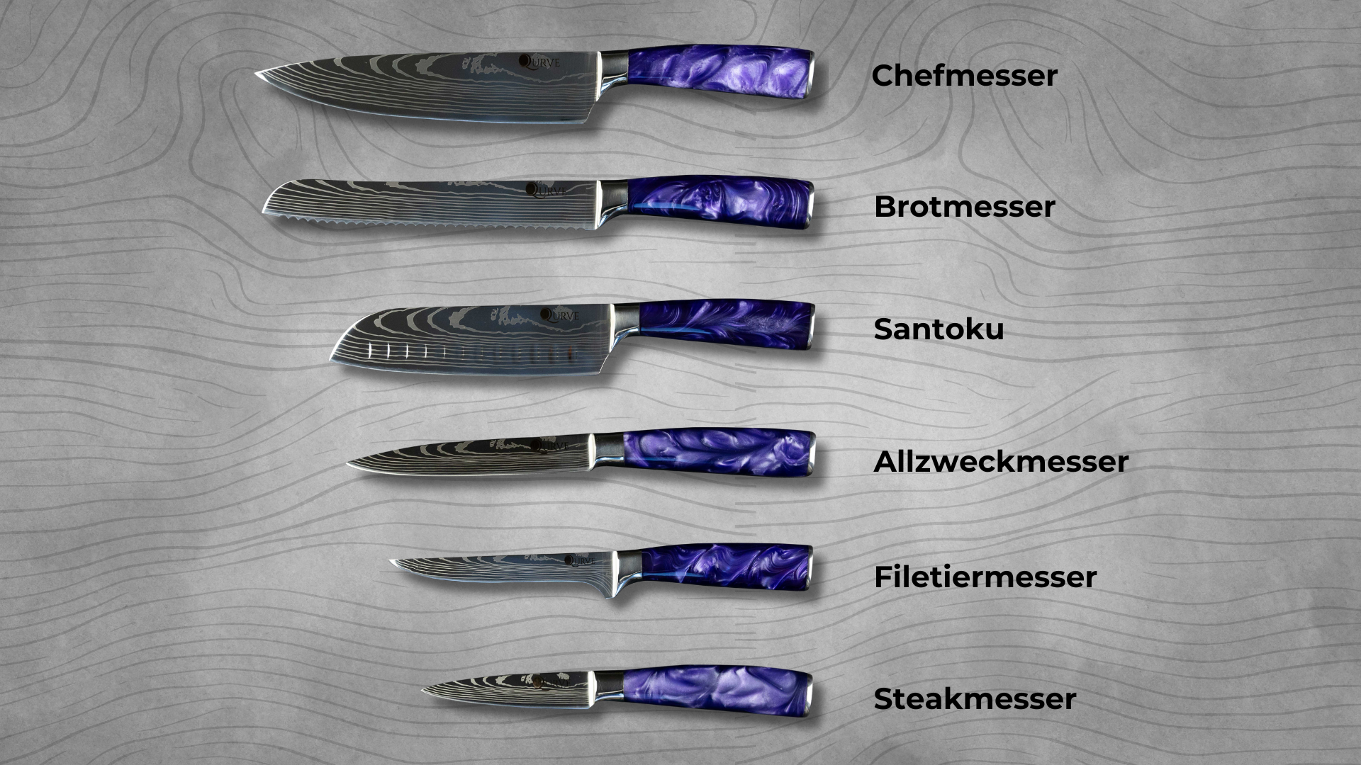 Erleben Sie die königliche Eleganz mit unserem neuen 6-teiligen Messerset "Purpura". Die Griffe dieses Sets präsentieren ein atemberaubendes Wirbelmuster aus königlichem Purpur und strahlendem Weiß, das wie ein Hauch von Majestät und Raffinesse wirkt. Jedes Messer wurde mit unübertroffener Präzision gefertigt, um Ihnen ein Schneiderlebnis zu bieten, das Ihre kulinarischen Grenzen erweitert. Von den scharfen Klingen aus hochwertigem Edelstahl bis hin zu den ergonomisch gestalteten Griffen – dieses Set verkörpert nicht nur Stil, sondern auch Funktionalität auf höchstem Niveau. Bringen Sie die königliche Atmosphäre in Ihre Küche und lassen Sie sich von der einzigartigen Energie des "Purpura" Messersets inspirieren!